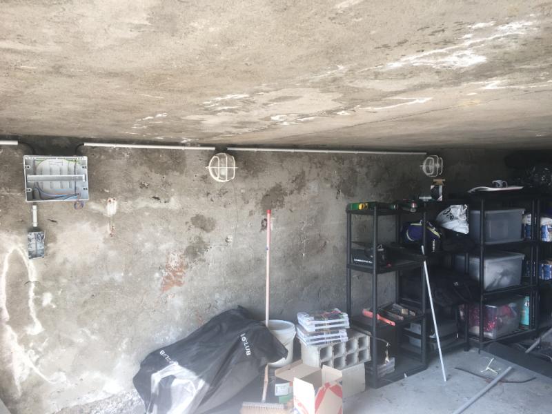 Installation dans un garage d'un tableau de protection étanche pour allimenter un circuit d'éclairage sous radar, une prise de courant, et une prise de courant de charge 20A pour voiture électrique.